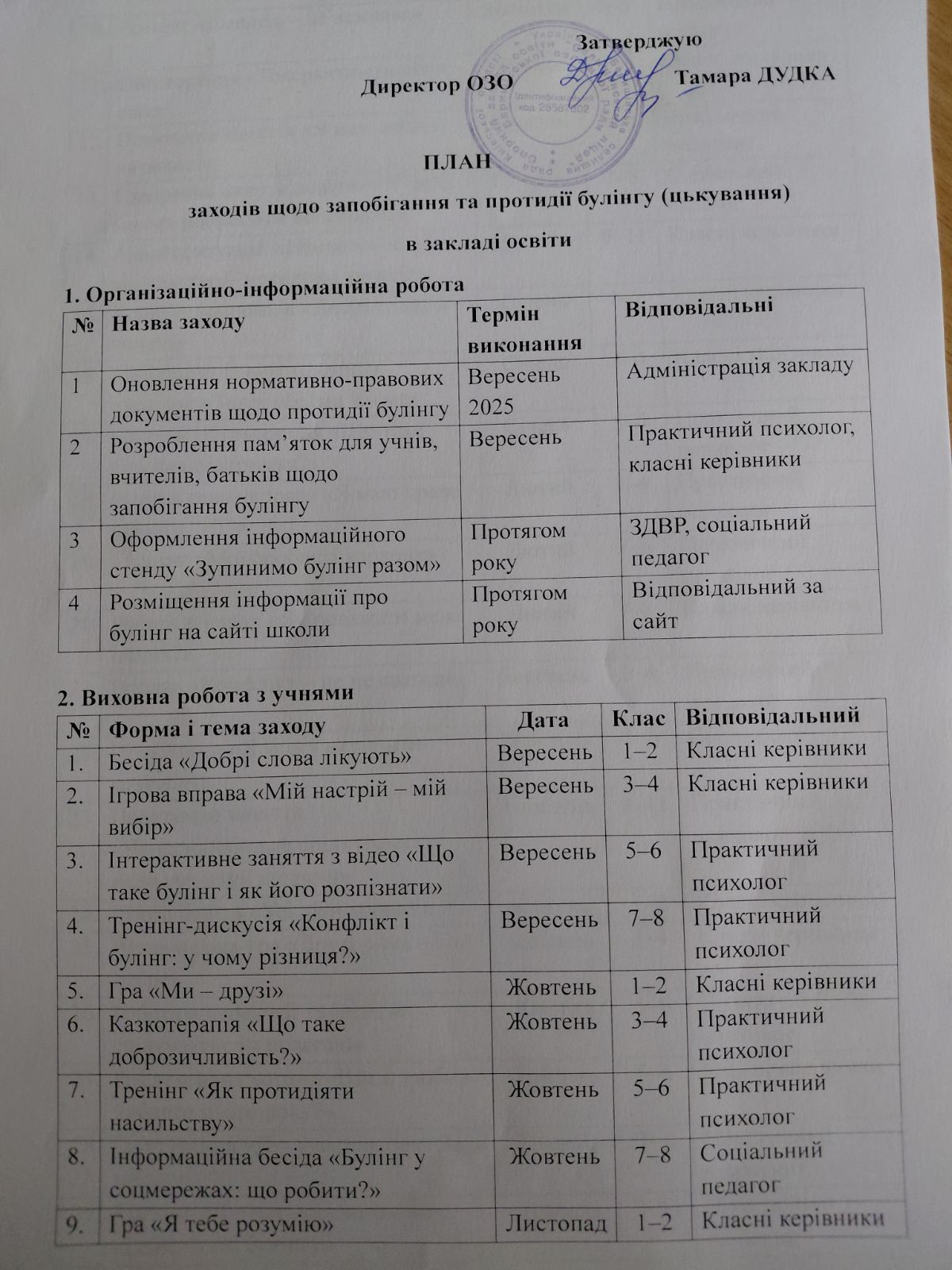 План заходів щодо запобігання та протидії булінгу (цькування) в закладі освіти